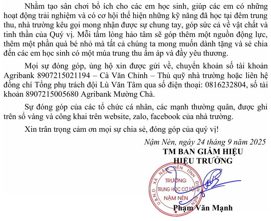 THƯ NGỎ VỀ TỔ CHỨC TẾT TRUNG THU NĂM HỌC 2025-2026